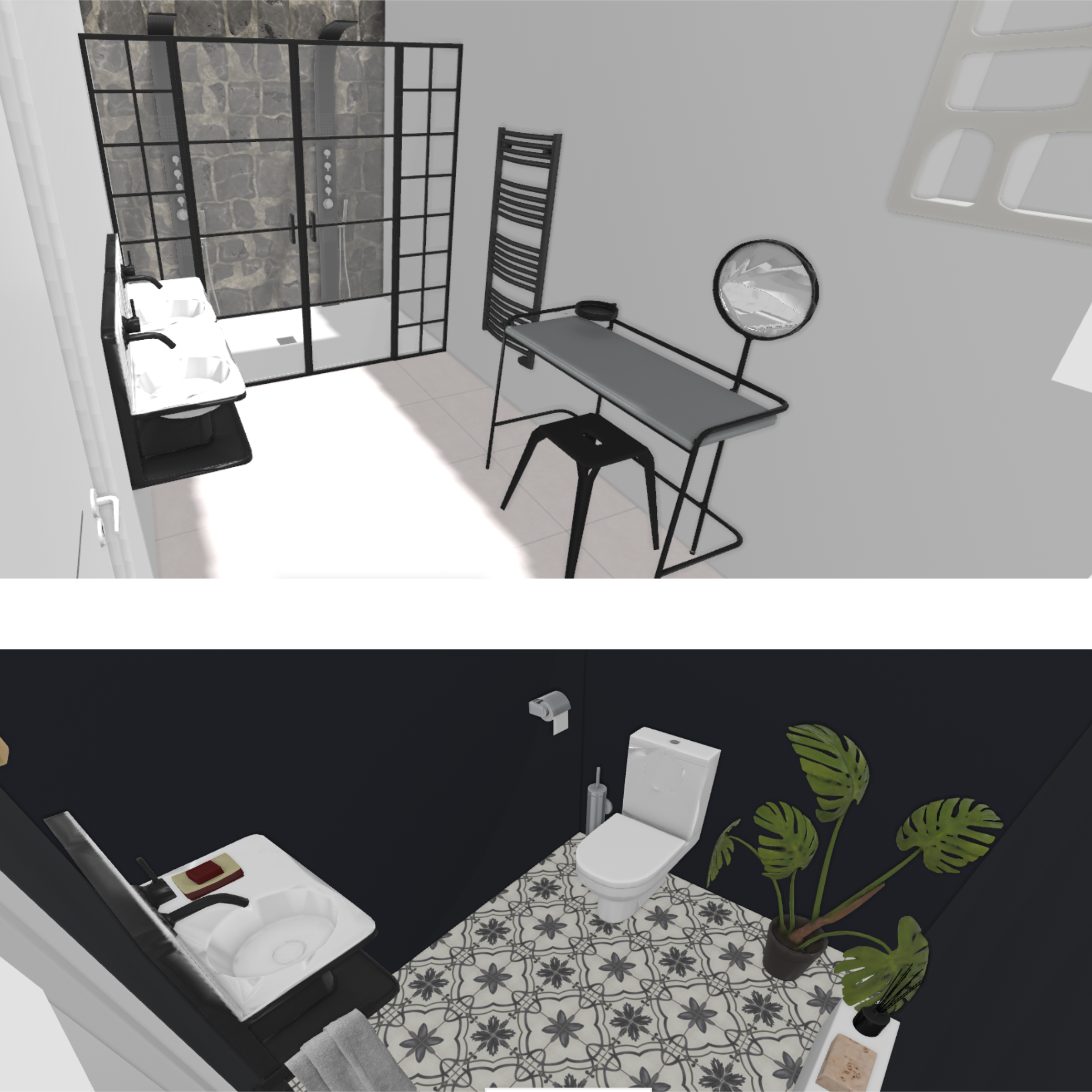 J’ai eu l’opportunité de concevoir cette maison grâce au site HomeByMe. Intuitif et simple d’utilisation, il m’a permis de créer des plans détaillés en 2D et de meubler chaque pièce en 3D, en les adaptant à mes envies. Les moodboards ont étés conçus sur Canva.