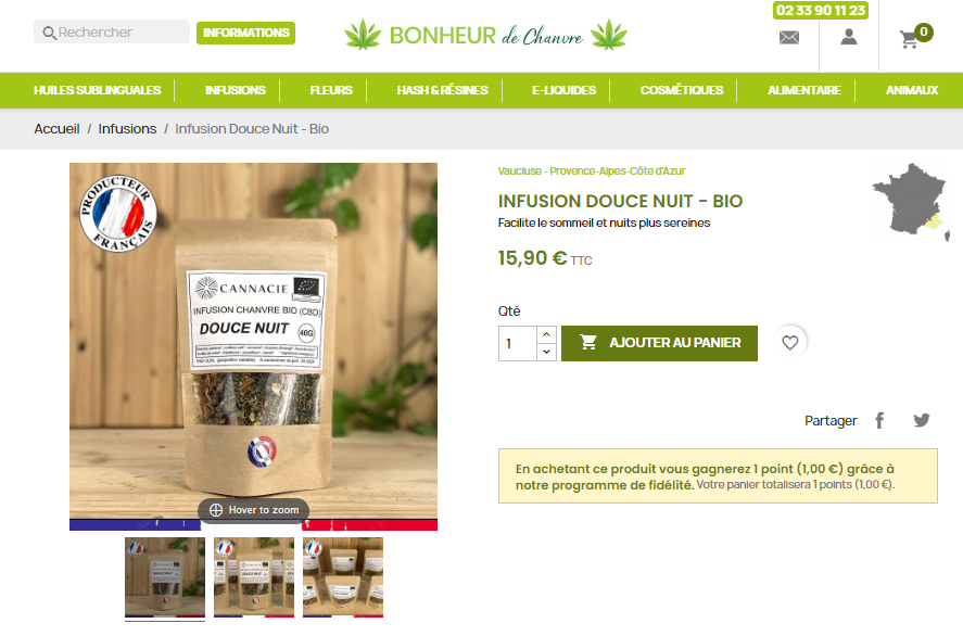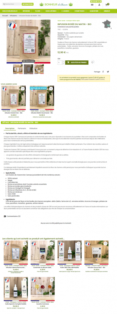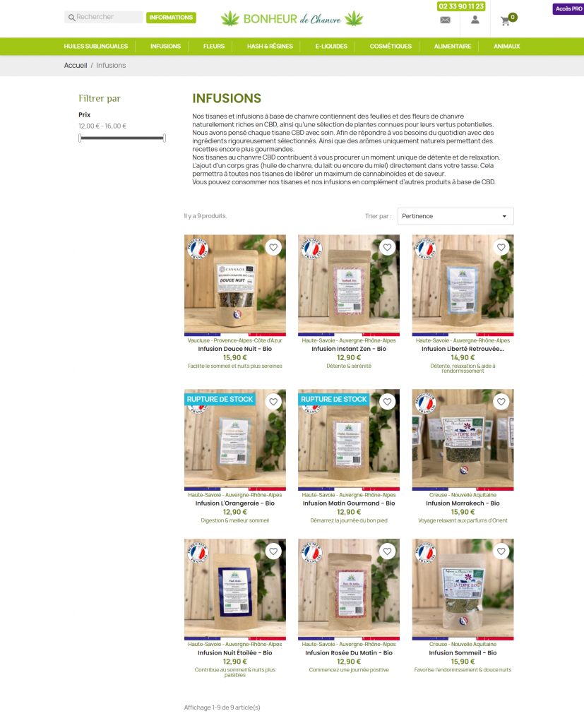Le site e-commerce de Bonheur de Chanvre a été créé sur Prestashop, tandis que leur site vitrine et blog ont été développés sur Typo3. Sans recourir à des maquettes, nous avons directement travaillé sur ces CMS, bénéficiant de l’expertise de mon tuteur d’alternance, également développeur.