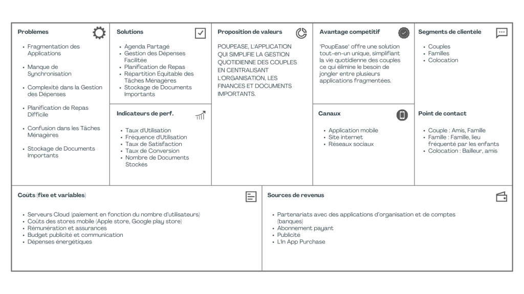 « PoupEase » simplifie la vie quotidienne des couples en centralisant l’organisation, la gestion financière, la planification des repas, les tâches ménagères et le stockage de documents importants pour une vie harmonieuse à deux.